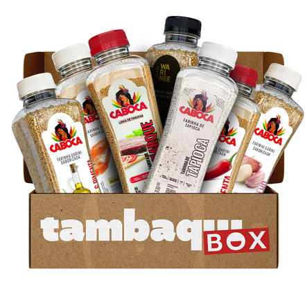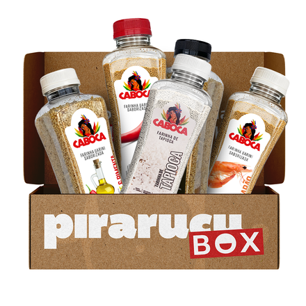 Box com 4 farinhas de 400g sabores (pimenta, alho, cebola, bacon, camarão e azeite) + 1 farinha de tapioca 320g).
